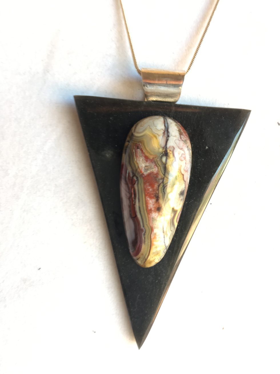 Necklace #4 Posted July 19, 2019 by Kate Lawrence $75 2 1/4″ Obsidian and Crazy lace Jasper with sterling bail, available with a silver plated neck collar or a silver plated 18″ or 20″ chain.
